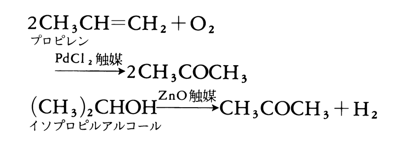 最も簡単な,そして量的にも最も重要な脂肪族ケトン。ジメチルケトンに相当する化合物で,化学式CH3-CO-CH3。融点-94.82℃,沸点56.3℃の無色の特異臭のある液体で,水やほとんどの有機溶媒とあらゆる割合で混合する。工業的には,プロピレンを塩化パラジウムを含む触媒の存在下で空気(酸素)酸化するワッカーWacker法,また酸化亜鉛などを触媒とするイソプロピルアルコールの脱水素法によって製造する。