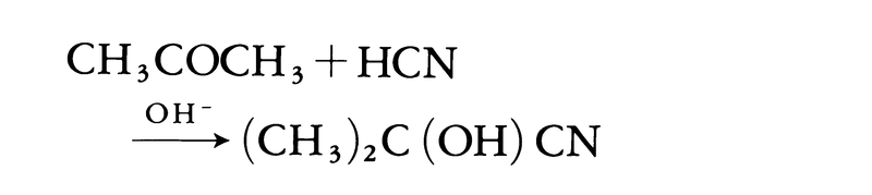 シアン化水素と塩基触媒のもとに反応し,アセトンシアンヒドリンが生成する。これはメタクリル酸合成に利用される。