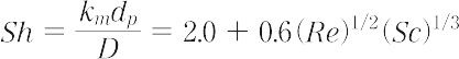 となる.ここで,Nu,Re,Prはそれぞれヌッセルト数,レイノルズ数,プラントル数で,いずれも無次元数であり,またkは流体の熱伝導率である.一方,この固体球がナフタレンでできていて,このナフタレンが流れに溶け出していくときの球表面での物質移動係数km は,上と同じ形の次式より求められる.