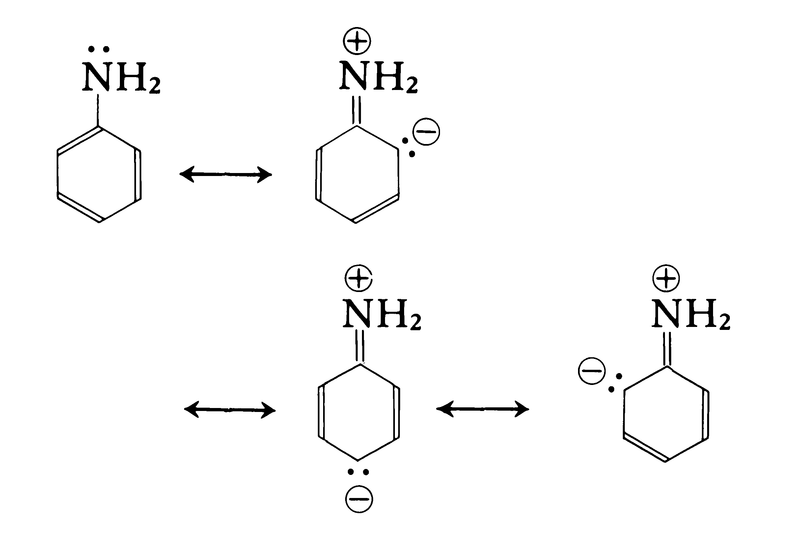 特異の臭気をもつ無色の液体で,融点-5.98℃,沸点184.55℃,比重1.022(20℃)。酸化されやすく,光または空気の作用でしだいに黄色から褐色,ついにはほとんど黒色となるが,亜鉛を加えて蒸留すると無色に精製される。水にはわずかしか溶けないが,ベンゼン,エチルアルコール,エーテルなどにはよく溶ける。塩基解離指数pKb=9.404(25℃)の弱い塩基で,塩酸,硫酸,酢酸などと反応して水に溶けやすい結晶性の塩をつくる。同じ第一アミンに属するメチルアミンCH3NH2はpKb=3.32(25℃)で,アニリンはこれに比べるとかなり塩基性が弱い。これは,芳香族アミンでは窒素原子上の非共有電子対がベンゼン環に非局在化するためである。これを下の図に示すような共鳴による安定化で説明することもできる。