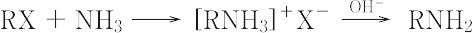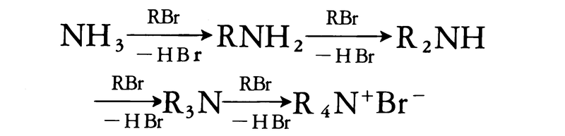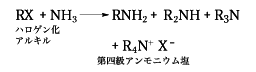 (1)-(a)ハロゲン化アルキルとアンモニアまたはアミンとの反応 ハロゲン化アルキルとアンモニアを反応させると,次のようにして第一,第二,第三アミンおよび第四アンモニウム塩の混合物ができる(アンモニアを大過剰に用いれば第一アミンが主として得られる)。