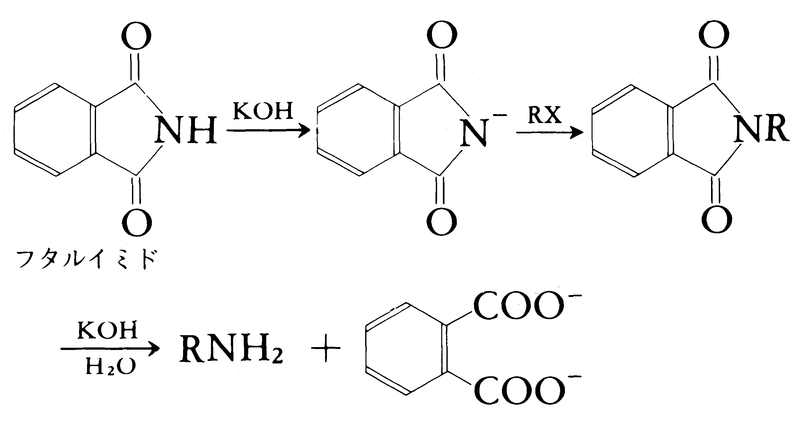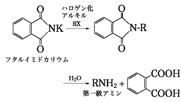 (1)-(b)ガブリエルGabriel反応 フタルイミドに水酸化カリウムを作用させてからハロゲン化アルキルを作用させ,生成物を加水分解する。第一アミンのすぐれた合成法である。