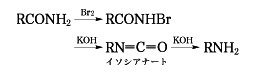 (5)酸アミドに臭素と水酸化アルカリを作用させる(ホフマン反応)。この反応は次の式に示すようにイソシアナート(イソシアン酸エステル)を経由する転位反応である。