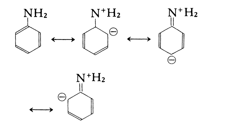 アミンは水よりも強い塩基なので水溶液中で塩基性を示す。一般にアミンは弱塩基であるが,その塩基性の強さは構造によってかなり異なり,pKb=-log Kb=-log[RN⁺H3][OH⁻]/[RNH2](Kbは式(1)の平衡定数)により定義される。pKb値が小さいほど塩基として強い。脂肪族アミンはアンモニアよりやや強い塩基である。これは,アルキル基が電子供与性なので共役酸(式(1)におけるRN⁺H3)を安定化するためである。アニリンはアンモニアよりかなり弱い塩基である。これは,アニリンが次のような共鳴によって安定化されているのに対し,共役酸C6H5N⁺H3ではこのような共鳴がないからである。