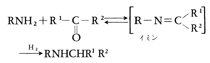 (2)-(d)イミンの還元(還元的アミノ化) 水素と水素化触媒の存在下にカルボニル化合物とアンモニアか第一アミンを反応させると,中間に生ずるイミンが還元されて第一アミンか第二アミンが生成する。