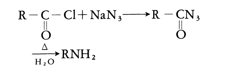 酸塩化物(酸ハロゲン化物)にアジ化ナトリウムを作用させてできる酸アジドを熱分解する方法や、カルボン酸にアジ化水素酸を作用させる方法によっても第一級アミンが得られ、いずれもイソシアナートを経由する。