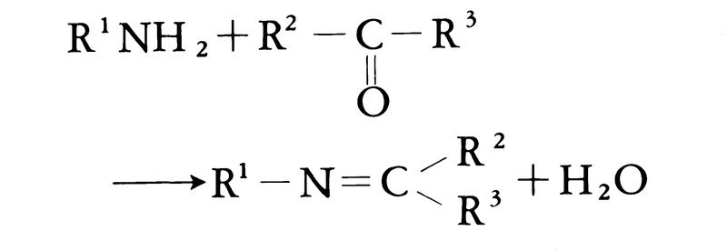 (2)-(c)シッフ塩基,エナミンの生成 第一アミンはアルデヒドまたはケトンと反応してシッフ塩基を生成する。