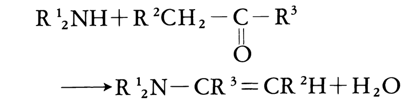 第二アミンとカルボニル基の隣にC-H結合をもつアルデヒドまたはケトンからはエナミンが生ずる。