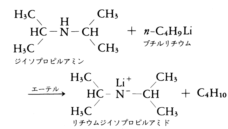 (5)酸としてのアミン 第一および第二アミンは非常に弱い酸でもある(pKa≅40)。アルキルリチウムのような強い塩基を作用させると,アミンは脱プロトンして共役塩基である陰イオンを生成する。これは非常に強力な塩基であって,とくにリチウムジイソプロピルアミドはカルボニル化合物のエノラートイオン発生によく用いられる重要な試剤である。