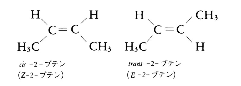 すなわち、二つのメチル基CH3-が二重結合に対して同じ側にあるシス型と反対側にあるトランス型である。二重結合の周りの回転はおこりにくいので、シス型とトランス型とはそれぞれ安定な異性体として存在する。ただし、紫外線照射下では二重結合の周りの回転がおこるので、トランス型とシス型との間の異性化がおこる。アルケンの二重結合は1組のσ(シグマ)結合と1組のπ(パイ)結合からなる。
