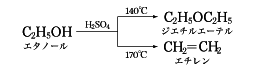 アルコールから1分子の水をとる脱水反応は、アルケンの合成上重要である。たとえばエタノールでは、濃硫酸と加熱すると、140℃程度の反応ではジエチルエーテルが生成し、170℃程度の反応ではエチレン(アルケンの代表的なもの)が得られる。