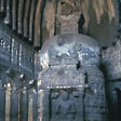 前2世紀になるとストゥーパに石材が用いられ、仏教的な主題の浮彫りで飾られるようになった。ストゥーパは仏陀(ぶっだ)の遺骨を納める墳墓で、本体である半球形の覆鉢(ふくはつ)の周囲に欄楯(らんじゅん)(玉垣)を巡らし、正面または四方に塔門を建てるのが通例である。その欄楯や塔門には、仏伝(仏陀の伝記)や本生譚(ほんしょうたん)(仏陀の前生の物語)などの仏教説話や動植物文様その他が浮彫りされた。サーンチー第2塔欄楯(前2世紀末)、バールフト塔の塔門と欄楯(前1世紀初頭)、ボードガヤー大精舎(しょうじゃ)の欄楯(前1世紀後半)などを経て、サーンチー第1塔塔門(1世紀初頭)に至って頂点に達した。石窟(せっくつ)寺院の造営も盛行し、西インドのデカン高原北端に前2~後2世紀に多数の仏教石窟が開かれた。奥にストゥーパを安置する祠堂(しどう)窟と僧院窟とから窟院が形成され、バージャー、アジャンタ、カールラーなどのものが名高い。これら前期石窟は全般に簡素で、木造建築の形式をかなり残し、浮彫りや絵画による装飾も少ない。ただし、アジャンタ第9、第10窟の古画は、紀元前後にさかのぼる仏教絵画最古の遺品である。ところで古代初期の仏教美術のもっとも目だった特徴は、いかなる場合にも仏陀の姿を表現しなかった点にあり、仏陀を主人公とする仏伝図浮彫りにおいても法輪、台座、足跡(そくせき)、傘蓋(さんがい)、菩提樹(ぼだいじゅ)などによって仏陀の存在を示唆するにすぎない。