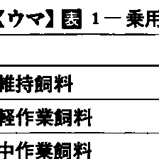 飼料の1日の量,配合割合はウマの体重,品種,性,年齢,季節によって異なるが,乗用馬の日量例を示せば表1のとおりである。ウマの飼料は牧乾草,麦稈(ばつかん),穀類(カラスムギ,オオムギ,トウモロコシ),ふすま,あら粉,青草(青刈飼料)などである。そのほか必要に応じ塩分,カルシウムを与える。飼料は朝,昼,夕の3回に分けて与え,夕飼をなるべく多くする。水は1日に20l以上も飲むので,給飼前に十分に与える。採食後はゆっくり休養をとらせた後,使役に用いる。そうでないと消化不良,胃腸障害をひき起こす。