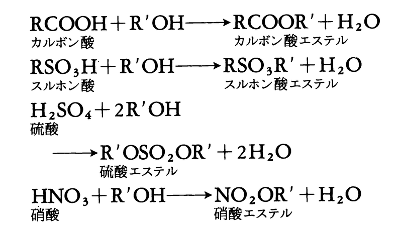 アルコールのエステルは、カルボン酸とアルコールを硫酸などの強酸の存在下において脱水縮合させてつくることができる。たとえば、酢酸エチルは酢酸とエタノール(エチルアルコール)から次の反応でつくることができる。