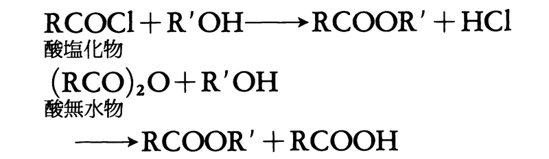 カルボン酸エステルの製法としては,(1)硫酸や塩化水素の触媒下にカルボン酸とアルコールまたはフェノールを縮合させる方法(フィッシャー法)や,カルボン酸とアルコールの混合物を300℃に加熱した酸化トリウムThO2触媒上を通過させる方法は工業的にも用いられ,最も一般的であるが,ほかにも実験室で用いられる方法としては下記のものがよく知られている。