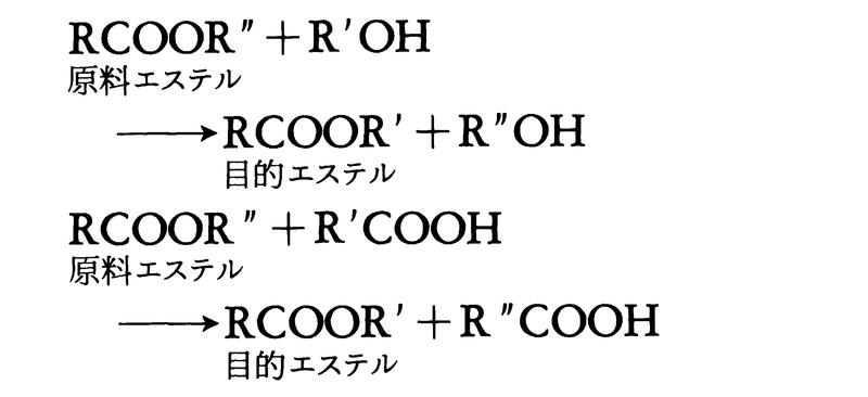 (5)エステル交換反応。目的とするエステルと同じカルボン酸またはアルコール部分のいずれかを含み入手しやすいエステルを原料として用い,もう一方の必要なカルボン酸またはアルコールを過剰に加えて水酸化ナトリウムなどの触媒の存在下に加熱し,目的エステルを得る方法(エステル交換)。