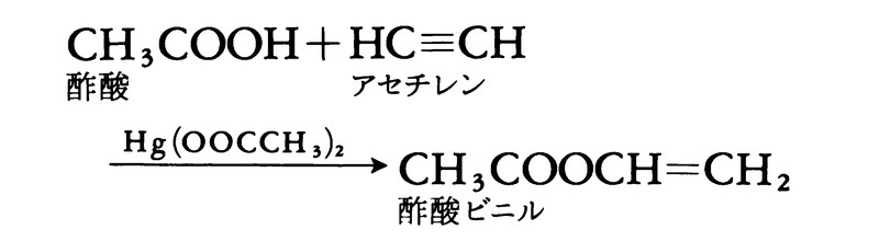 (6)酢酸第二水銀を触媒としてアセチレンに酢酸を付加する。この方法は合成高分子の原料である酢酸ビニルの製造に用いられる。