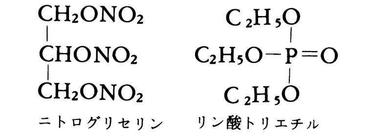 無機酸エステルのうち,硫酸ジメチル(CH3)2SO4は重要なメチル化剤としてよく用いられているが,有毒な液体(沸点187.5℃)であるので取扱いに注意が必要である。これはヨウ化メチルと硫酸銀とを高温で反応させて製造する。ダイナマイトの基剤としてよく知られているニトログリセリンはグリセリンの硝酸エステルで,正しくは三硝酸グリセリンと呼ばれ,グリセリンを冷却した1:1混酸(硫酸+硝酸)中に滴下して得られる。亜硝酸アミルC5H11ONOは快香をもつ液体(沸点96℃)で,血管を拡張する作用があるため狭心症の治療薬として用いられる。リン酸のエステルであるリン酸トリエチルは無色の液体(沸点216~217℃)で,ニトロセルロースや酢酸セルロースの溶剤として用いられたり,ゴムや合成樹脂の可塑剤として用いられる。また,リン酸エステルは生体内で多く見いだされ,生命現象に重要な役割を果たしている。
