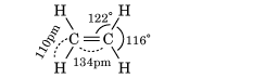 その分子構造は次の通りである。すなわち、炭素‐炭素二重結合の間隔は飽和炭化水素のエタンなどの154ピコメートルに比べて短いが、それに結合する水素との結合間隔はエタンと等しく110ピコメートルである。