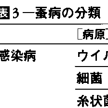 カイコの病気には,各種の病原微生物の感染によって起こるウイルス病,細菌病,糸状菌病および原虫病のほか,昆虫やダニなどの寄生による寄生虫病がある。また,タバコや種々の農薬あるいは工場から排出された煤煙(ばいえん)中の有毒物質によって発生する中毒症もある。蚕病が発生した場合には,それ以上病気が広がらないように病蚕の除去,適当な消毒処置を施すことが必要である。このために,発生した蚕病がどのような種類のものか的確に診断しなければならない。
