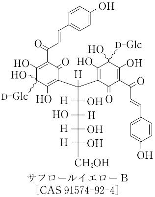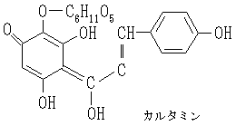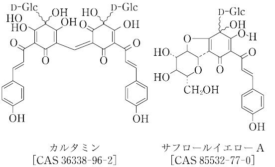C43H42O22(910.77).キク科ベニバナCarthamus tinctorius の花びらには,フラボノイド系色素カルタミン(赤色)とサフロールイエロー(safflor yellow)A,B(黄色)が含まれている.水溶性のサフロールイエローを水で溶出した後,炭酸ナトリウム水溶液でフェノール性のカルタミンを溶出する.赤色の針状晶(ピリジン).融点228~230 ℃.紅染の染料として用いるほか,食品,化粧品の着色に用いられる.【Ⅰ】サフロールイエローA:C27H30O15(594.51).λmax 400,335.226 nm(ε 10200,6200,7800.メタノール).【Ⅱ】サフロールイエローB:C48H54O27(1062.94).λmax 408,330,240 nm(ε 22600,14600,10900.メタノール).