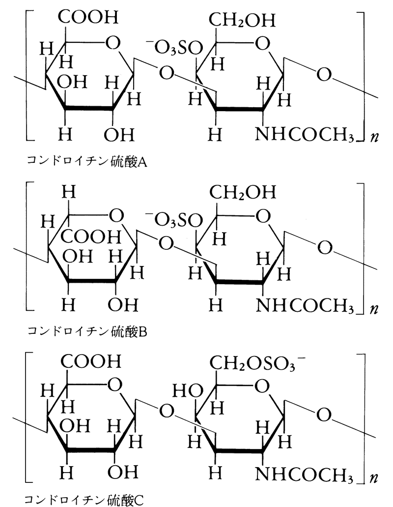 酸性多糖の一種。ウロン酸とN-アセチルガラクトサミンが結合した2糖の繰り返しを基本構造としたムコ多糖で,分子量約2万。ウロン酸の種類,硫酸基の結合位置によって,主として三つの種類のコンドロイチン硫酸が知られている。すなわち,コンドロイチン硫酸A,コンドロイチン硫酸B(デルマタン硫酸ともいう),コンドロイチン硫酸Cである。コンドロイチン硫酸Aは骨,角膜,Bは皮膚に特に多く存在する。また軟骨はAとCを持つ。コンドロイチン硫酸の研究は,名古屋大学の鈴木旺らが開発した特異的分解酵素コンドロイチナーゼを使用することによって急速に進んだ。この多糖鎖は遊離の形ではなく,タンパク質と共有結合したプロテオグリカンとして組織中に存在している。糖部分とタンパク質部分の結合はキシロースとセリンのO-グリコシドであり,弱アルカリ処理によって解裂する。プロテオグリカンのタンパク質部分は分子量20万強で,これに100本程度のコンドロイチン硫酸鎖,さらにいくつかのケラタン硫酸鎖が結合していて,分子全体としては平均200万の分子量を持つことになる。プロテオグリカンは主として細胞間の基質として存在するが,その場合プロテオグリカン分子は,直鎖状のヒアルロン酸を軸にムカデの足状に集合し,プロテオグリカン集合体となる。プロテオグリカン集合体はさらにコラーゲン繊維と相互作用して網目構造を作っている。プロテオグリカン集合体とコラーゲンを結びつけているのはフィブロネクチンと呼ばれる糖タンパク質である。プロテオグリカンの生合成は細胞の状態によって大きく影響を受ける。たとえば,老化agingが進むとコンドロイチン硫酸の占める割合が減少し,成長ホルモンは硫酸化多糖の生合成を促進する。
