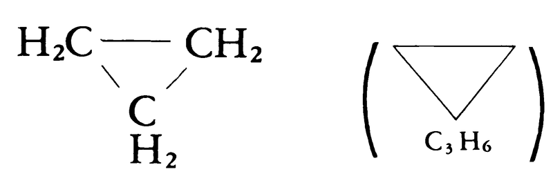 シクロアルカンの一つ。トリメチレンともいう。無色の可燃性気体。酸素と爆鳴気をつくる。合成は1,3-ジクロロプロパンと亜鉛のウルツ反応によるか、エチレンへのカルベン付加反応(シモンズ‐スミス反応)による()。シクロプロパンは炭素結合角のひずみが大きく、そのため3員環を構成している炭素‐炭素結合(C-C)は折れ曲がった結合(バナナ結合)である。開環のとき、ひずみのエネルギーを放出するので、他のシクロアルカンよりはるかに反応性に富んでいる。ニッケル触媒上、120℃で水素化され、プロパンを与える。ルイス酸触媒下では臭素と反応して1,3-ジブロモプロパンを、また、水が付加して1-プロパノールを生成する。酸素との混合体は吸入麻酔剤として用いられる。
