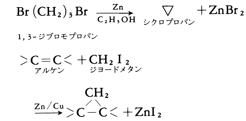 サイクロプロペインともいう。3員環の炭化水素。常温で無色の気体。融点-127.53℃,沸点-32.7℃。代表的な合成法としては,(1)アルコール中で1,3-ジブロモプロパンに亜鉛を作用させて作る方法と,(2)亜鉛-銅カップルの存在下に,エーテル中でアルケンとジヨードメタンとを反応させて作る方法があり,後者はとくにシクロプロパン誘導体の合成に適している。