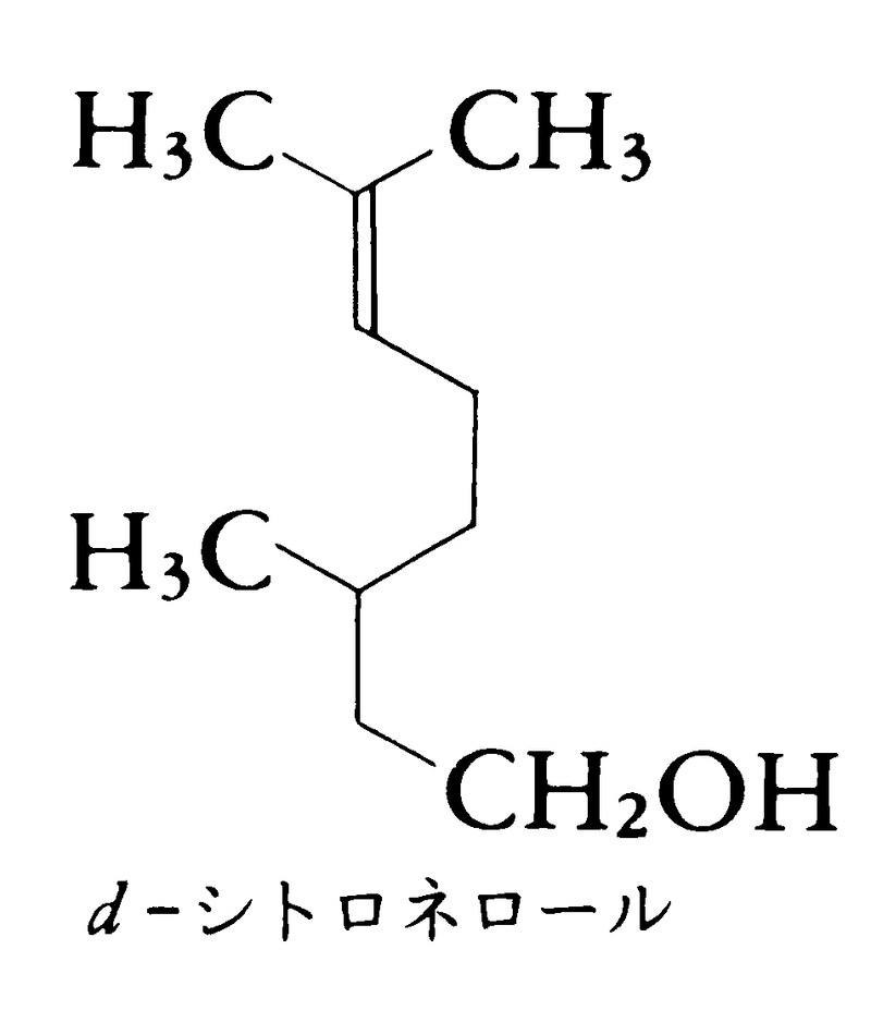 ゼラニウム油,シトロネラ油などの精油成分として存在する新鮮なローズ様の甘い香気をもつ無色の液体。天然のシトロネロールは,ゲラニオールなどの共有する各種の不純物により,その香気は若干変化する。非環式モノテルペンに属するアルコールで,d-,l-の光学異性体が存在する。比重0.86,沸点225℃,引火点102℃。水に難溶,アルコール,エーテルに可溶だがグリセリンには不溶。ゼラニウム油,シトロネラ油を蒸留,精製して採取する。合成法としては,シトロネラール,ゲラニオールの接触水素添加による。またβ-ピネン,ミルセンを経ての合成法,イソプレンからの合成法もある。ゲラニオールより,さらに甘い香気をもち,セッケン,芳香剤,香粧品,とくにローズ系調合香料ベースとして広く用いられる。