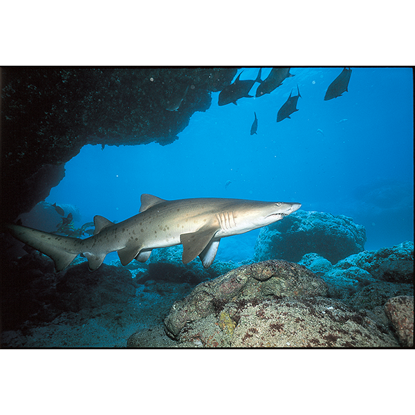 軟骨魚綱ネズミザメ目の科や属の総称、またはその1種の名称。シロワニ科Carchariidaeはシロワニ属CarchariasのシロワニC. taurus1属1種からなる。シロワニ(英名sandtiger shark)は第1背びれが後方にあって胸びれよりも腹びれに近いこと、臀(しり)びれが大きく第2背びれとほぼ同じ大きさであること、体が灰褐色で、しみ状の暗色小斑点(はんてん)が散在することなどの特徴をもつ。本種は空気を飲み込み、胃にためることで中性浮力をつくるおもしろい習性をもっている。昼間は岩礁地帯、水中洞窟(どうくつ)、サンゴ礁などに潜み、夜は浅海から水深200メートルくらいまでの間で活動する。ときに20~80尾の集団をつくり、ゆるい社会構造をつくる。生殖方法は食卵型の胎生で、一度に1メートルほどの子を2尾産む。最大で3.2メートルほどになる。西部太平洋、インド洋、大西洋、地中海の温熱帯海域に分布する。国際自然保護連合(IUCN)のレッド・リストでは、絶滅危惧(きぐ)種中の「深刻な危機」(CR)に指定されている(2021年9月時点)。