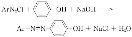 アルカリ性でフェノール類や芳香族アミン類を作用させるとカップリング反応をおこしてp(パラ)-ヒドロキシアゾベンゼンやp-アミノアゾベンゼンなどのアゾ化合物が得られる(ジアゾカップリング反応。の(3)参照)。この生成物はアゾ色素とよばれ、黄色ないし赤色で、染料として重要である。