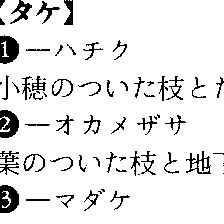 最後に語源について触れておくと,貝原益軒《日本釈名(にほんしやくみよう)》(1699)は〈竹(たけ)高きなり。けとかと通ず。筍(たかんな)は旬日の間に長じて,高き事天にそびゆ。是草の中いと高き物也〉と説明する。谷川士清(ことすが)《和訓栞(わくんのしおり)》(1777)には〈○たけ 長をいふハ高きの義也年のたけたる徳のたけたるなと皆同意なり○丈をよむも長き意也○竹ハ一旬にして長高きの意也といへり〉とある。大槻文彦《言海》には〈たけ(名)竹[丈(たけ)高ク生ヒ延ブレバイフ]植物ノ名〉とある。これらの語源説明が駄じゃれに過ぎると考える人には,唐音tiku,呉音tuku,tokuならば簡単にtaku,takeに音声的転化がなされうるとの参考意見を添えておく。