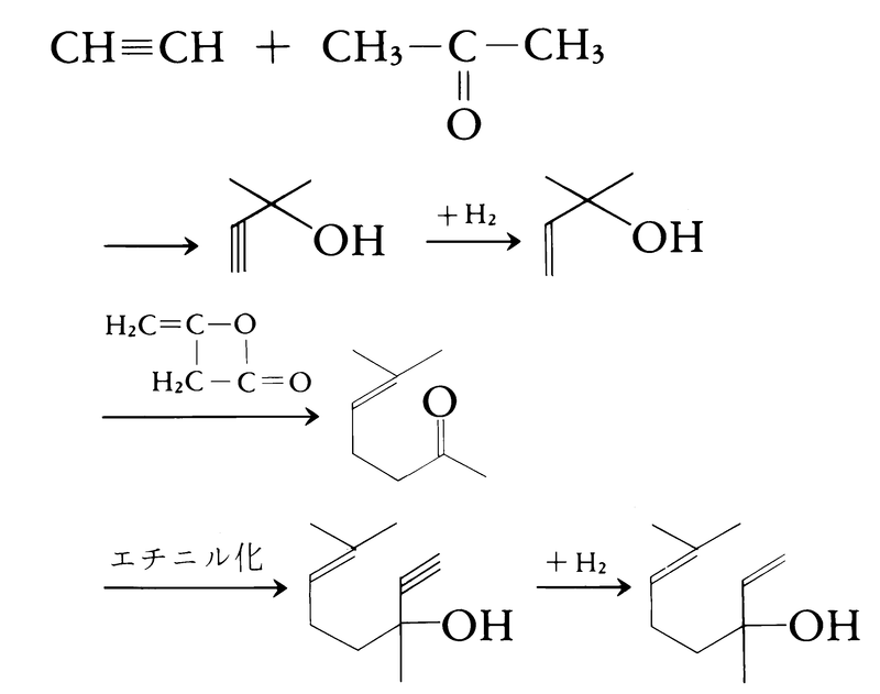 (2)アセチレン-アセトン法(全合成法) アセチレンとアセトンから出発し,メチルヘプテノンを経て各種テルペンアルコール,テルペンアルデヒドを合成するもので,次式に示すロッシュRoche法で代表される。選択性はよいが,1段階ずつ合成するため多段のステップを必要とする。