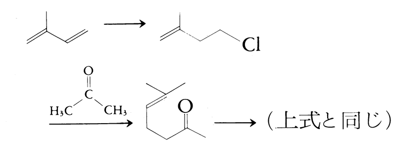 (3)プレニルクロライドを用いる方法(全合成法) 次式に示すローディアRhodia法が代表的なものである。