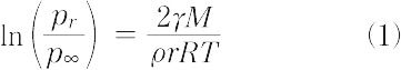 液体の小滴が小さくなるにつれて,その蒸気圧pr が平滑な液面の示す蒸気圧 p∞ より大きくなることや,気相に対して,毛管のなかで凹面をなす液面の蒸気圧が上と逆に普通の蒸気圧より低くなることを示す法則で,W. Thomson(Lord Kelvin:1871年)によって次の関係が与えられた.
