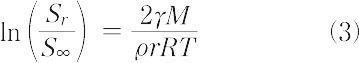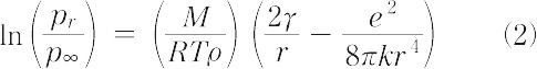 ここに,γは液体の表面張力,Mは分子量,ρは密度,rは液体粒子の半径,Rは気体定数,Tは絶対温度である.毛管中の水などで液面が凹面になるときには,上式の左辺の分子と分母は逆になり,毛管凝縮の原因となる.上式によると蒸気相の蒸気圧が飽和状態に達しても,液相(霧)の出現は不可能となる.これは過冷却あるいは過飽和現象である.しかし,このとき,気相中にイオンが存在すると霧が発生することから,上式はThomsonによって,