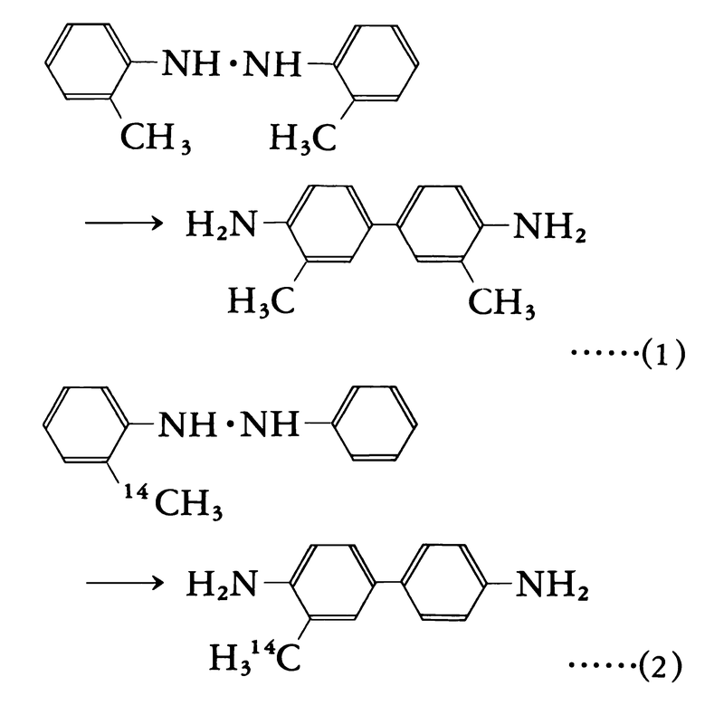 2,2′-ジメチルヒドラゾベンゼンは,酸により(1)式のような転移を起こし,3,3′-ジメチルベンジジンを生成する。この反応はベンジジン転移として知られている。2,2′-ジメチルヒドラジンに14Cで標識した2-メチル-14C-ヒドラゾベンゼンを混合して転移を起こさせると,3,3′-ジメチルベンジジン中に14Cは含まれず,3-メチルベンジジン中にのみ含まれる。これにより,転移反応は下に示すように,-NH・NH⁻結合が切断した切片が他分子からの切片と結合することはなく,分子内で起こっていることが明らかとなった。