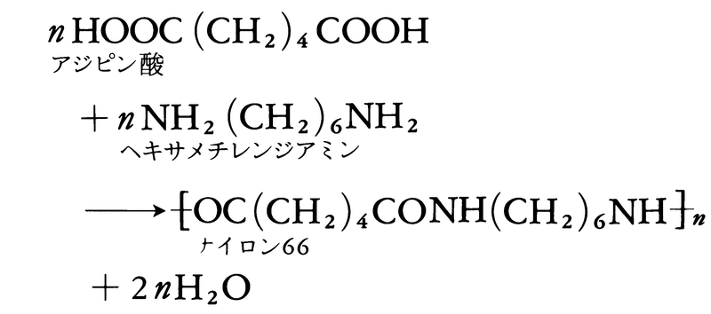 アジピン酸とヘキサメチレンジアミンの等モルをアルコールまたは水を溶媒として混合すると、ナイロン6,6塩(融点183~184℃)NH3⊕(CH2)6NHOC(CH2)4COO⊖を生成する。この塩水溶液を加熱脱水して重縮合(縮合の繰り返しによって低分子物質から高分子物質を生成させる反応をいう)させていき、溶融状態で紡糸機で糸を引き出す溶融紡糸を行う。