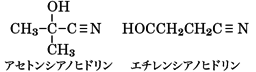 (4)ケトンやアルデヒドにシアン化水素を付加させると得られるα(アルファ)-ヒドロキシニトリルおよびアルケンオキシドとシアン化水素の付加物であるβ(ベータ)-ヒドロキシニトリルは、シアノヒドリン(シアンヒドリン)とよばれる。アセトンのそれはアセトンシアノヒドリン、エチレンオキシドのそれはエチレンシアノヒドリンとよばれる。