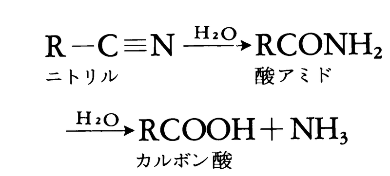 低分子量のニトリルは,特異な臭いをもつ無色の液体で,炭素数が多くなると水に溶けにくくなる。アクリロニトリルCH2=CHCNのように有毒なものもあるが,ニトリルの毒性はさほど強くない。無機酸または無機塩基を触媒として加水分解すると,酸アミドを経由してカルボン酸とアンモニアを生じる。
