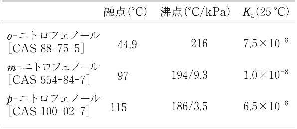 芳香族ニトロ化合物の一つ。ベンゼン環にヒドロキシ基-OHとニトロ基-NO2がついた化合物で、ニトロ基の置換位置によりo(オルト)-、m(メタ)-、p(パラ)-ニトロフェノールの三異性体がある。オルト体(融点45.8℃)、メタ体(融点97.6℃)は黄色、パラ体(融点114.9~115.6℃)は無色の結晶で、いずれもフェノールよりも酸性が強く、アルカリ水溶液や、種々の有機溶媒によく溶ける。フェノールに33%硝酸を加えると、オルト、パラ体の混合物を生ずるので、水蒸気蒸留により留出するオルト体と残るパラ体とを分離する。メタ体は、m-ニトロアニリンをジアゾ化し、水と加熱すれば得られる。いずれも、還元すれば対応するアミノフェノールになるので、種々の染料や医薬、写真現像薬などの製造に用いられる。