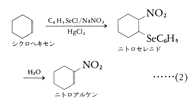 また亜硝酸ナトリウムを塩化水銀(Ⅱ)HgCl2の存在下でベンゼンセレニルクロリドC6H5SeClおよびアルケン(たとえば,シクロヘキセン)と反応させると,ニトロセレン化が起こる(式(2))。