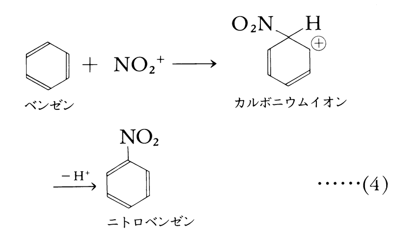 ここで生成する中間体のカルボニウムイオンは速やかにプロトンを放出してニトロベンゼンが生成する。この反応の律速段階は,ニトロニウムイオンが攻撃を行う最初の段階である。このような芳香族化合物のニトロ化は工業的にもきわめて重要な反応であり,トルエンのニトロ化によるトリニトロトルエン(TNT)は火薬の原料として,あるいは多くの芳香族ニトロ化合物は染料その他のいろいろな原料製造のための出発物質として重要である。