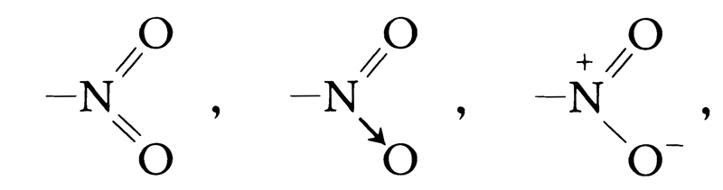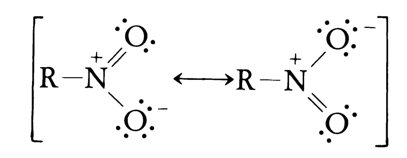 有機ニトロ化合物中の1価の官能基。通常-NO2で表す。本来は炭素と結合しているNO2を指すが,硝酸エステルR-ONO2中の-NO2もニトロと呼ぶことが多い。種々の式が提案されているが,二つのルイスLewis構造式の間の共鳴で表す場合が多い。