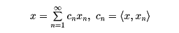 x,y∈Hに対して〈x,y〉=0ならば、xとyは直交するという。すると、ヒルベルト空間には互いに直交する要素の列{xn;‖xn‖=1}が存在し、Hの任意の要素xは