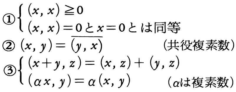 が成立する。一般に,複素数体上のベクトル空間(有限次元とは限らない)Xがあって,任意のx,y∈Xに対してその内積と呼ばれる量(x,y)が定義されて(1),(2),(3)を満たすとき,Xを内積空間という。内積空間において(4)で定義される/x/をxのノルムという。この場合にも有限次元の場合と同様に(5)が成立する。さらにdis(x,y)=/x-y/は距離の性質をもち,Xは距離空間になる。内積空間は,その内積から上のように定義されたノルムによる距離に関して完備なとき(