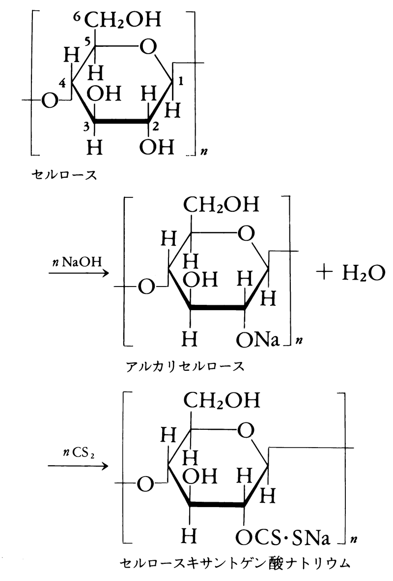セルロース原料としては木材パルプが使われる。高分子であるセルロースはある重合度(式ではnで表されている)をもつが,ビスコースレーヨンの製造プロセスではセルロース主鎖の切断は避けられず,重合度は約1/4に低下する。ビスコースを硫酸紡糸浴へ入れると,セルロースが再生される。