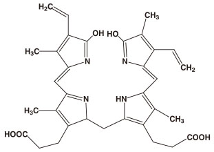 C33H36N4O6(584.65).胆赤素ともいう.ヘモグロビンの分解産物で,ビリベルジンとともに胆汁色素の主成分であり,血清中にも少量存在する.ウシの胆石やブタの胆汁から抽出される.