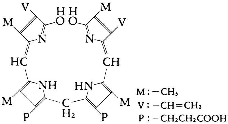 胆汁色素の主成分で,赤褐色を呈するので,胆赤素とも呼ばれ,生体中ではビリベルジンの還元によって生成される。血清の淡黄色は主としてこの物質の存在による。胆汁の色調も,ビリルビンとビリベルジンの混在する比率により支配される。血清中にビリルビンが増加した状態が黄疸である。健康成人で1日250~300mgのビリルビンがつくられるが,その85%は,老化した赤血球の崩壊により生じたヘモグロビンの構成成分であるヘム由来である。残りの15%は,ヘモグロビンの崩壊と無関係な肝臓内のヘム,チトクロム酵素,骨髄の赤血球前駆物質由来である。ヘムからビリルビンへの分解は主として肝臓で,一部は脾臓で行われる。