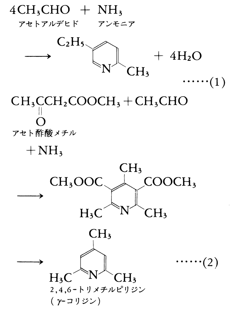 ピリジンは不快な臭気をもつ無色の液体で,融点-41.8℃,沸点115.50℃。水とは自由に混合する。コールタールから得られるほか,その同族体はチチバビンchichibabinのピリジン合成(式1),ハンチHantzschのピリジン合成(式2)などで合成される。